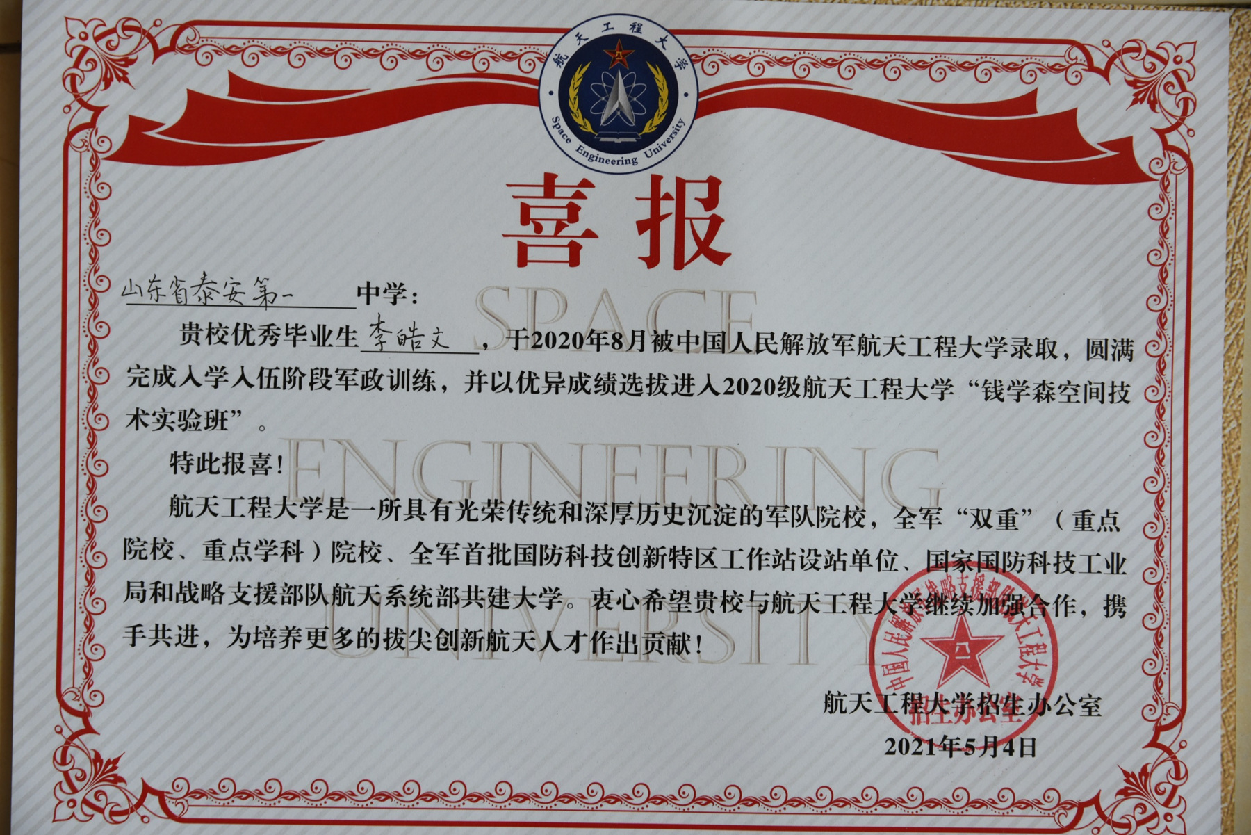 航天工程大学向泰安一中发来喜报
