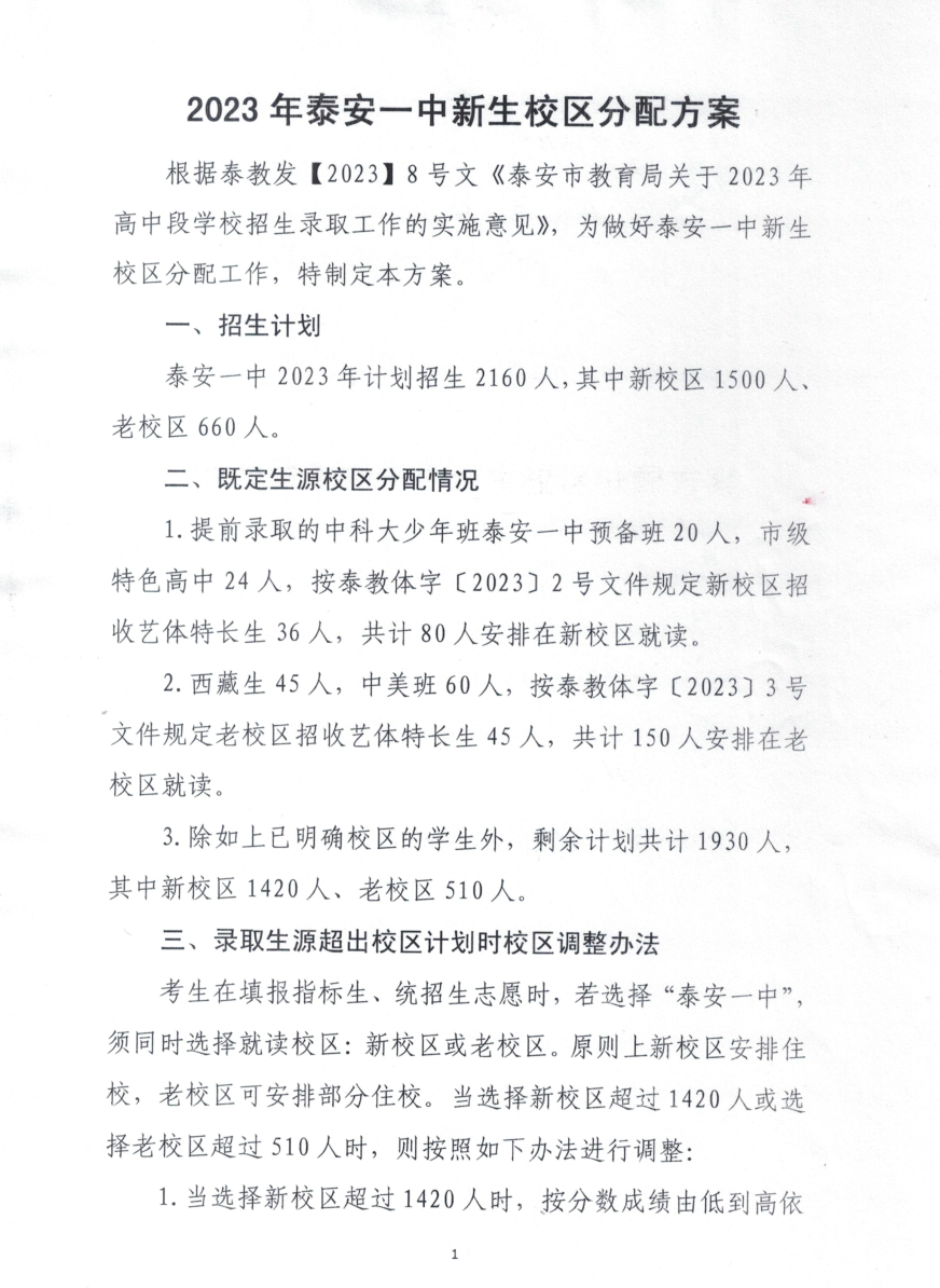 2023泰安一中新生校区分配方案