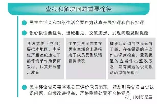 各级党组织和广大党员要坚持学做结合,突出针对性,敢于直面问题,勇于自我革命,把查找解决问题作为“两学一做”学习教育的规定要求。 党员要对照党章党规,对照系列讲话,对照先进典型,把自己摆进去,经常自省修身,打扫思想灰尘、进行“党性体检”,有什么问题解决什么问题,什么问题突出重点解决什么问题;要查找分析理想信念是否坚定、对党是否忠诚老实、大是大非面前是否旗帜鲜明、是否做到在思想上政治上行动上同以习近平同志为核心的党中央保持高度一致,着力解决党的意识不强、组织观念不强、发挥作用不够等问题。 各级党委(党组)要查找分析是否落实全面从严治党主体责任,是否坚决执行党的理论和路线方针政策,是否认真坚持民主集中制,着力解决党的领导弱化、党的建设缺失、管党治党宽松软等问题。 党支部要查找分析组织生活是否经常、认真、严肃,党员教育管理监督是否严格、规范,团结教育服务群众是否有力、到位,着力解决政治功能不强、组织软弱涣散、从严治党缺位等问题。 要把党的组织生活作为查找和解决问题的重要途径,注意听取群众的意见和反映,抓早抓小、防微杜渐。民主生活会和组织生活会要严肃认真开展批评和自我批评,坚持“团结-批评-团结”,严于自我解剖,热忱帮助同志。谈心谈话要经常,坦诚相见、交流思想,发现问题及时提醒。各级党委(党组)要把本地区本部门本单位严重违纪违法干部忏悔录作为反面教材,认真开展警示教育。主要负责同志要在民主生活会上通报班子成员受到谈话函询情况;被谈话函询的党员领导干部,存在错误的应当作出深刻检查,受到提醒的应当作出整改表态,没有问题的说明谈话函询情况即可。民主评议党员要客观公正评价党员表现,帮助引导党员自觉认识问题、自我改进提高,严格稳慎处置不合格党员。