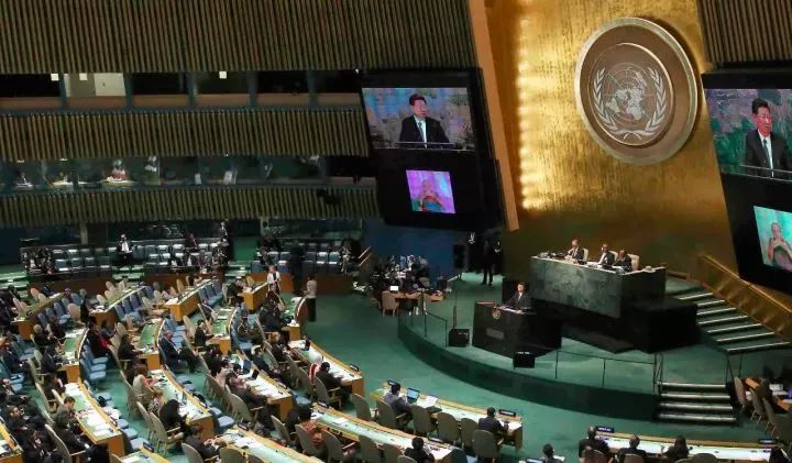 2015年9月28日,国家主席习近平在纽约联合国总部出席第70届联合国大会一般性辩论并发表题为《携手构建合作共赢新伙伴 同心打造人类命运共同体》的重要讲话。 新华社记者庞兴雷摄 约140位国家元首或政府首脑出席联大一般性辩论,17位国家领导人28日上午发表政策讲话,习近平主席收获了次数最多、最热烈的掌声。 在联合国这样的场合发表演讲,与会者用掌声,表达了对中国大国担当精神和习主席大国领袖风范的敬意和钦佩。 深邃思考