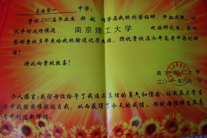 南京理工大学致我校喜报