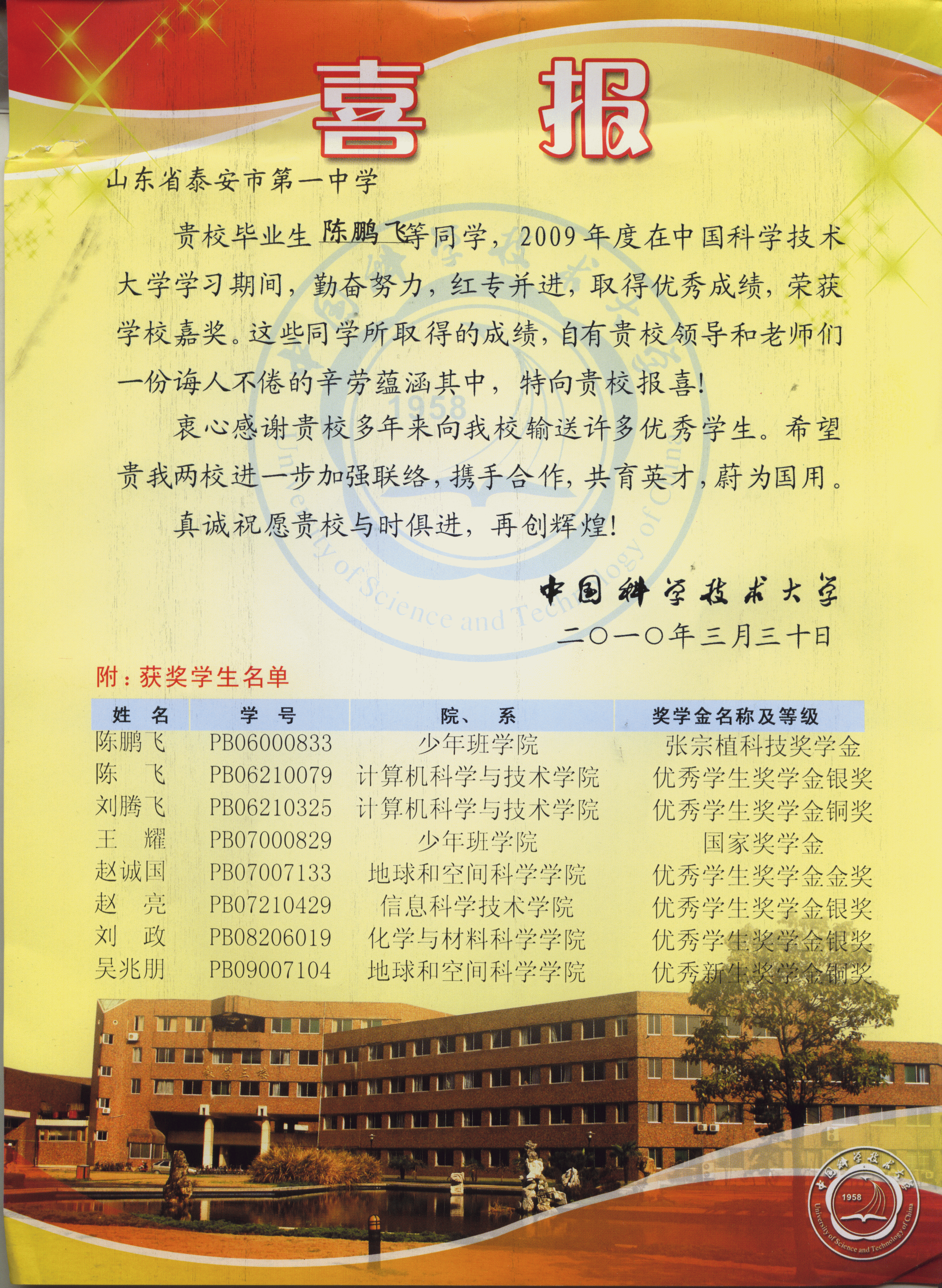 中国科学技术大学致我校喜报:泰安一中优秀毕业生陈鹏飞、陈飞等8人2009年度在中科大学习期间,勤奋努力,成绩突出,获学校嘉奖。