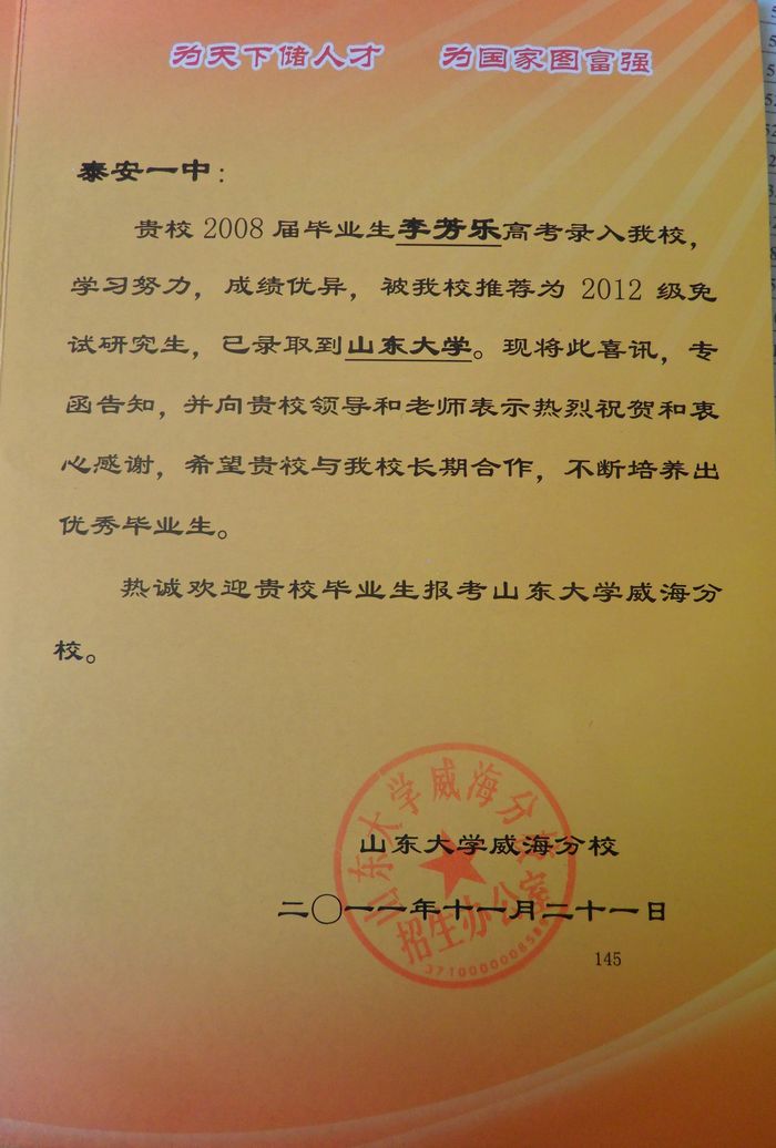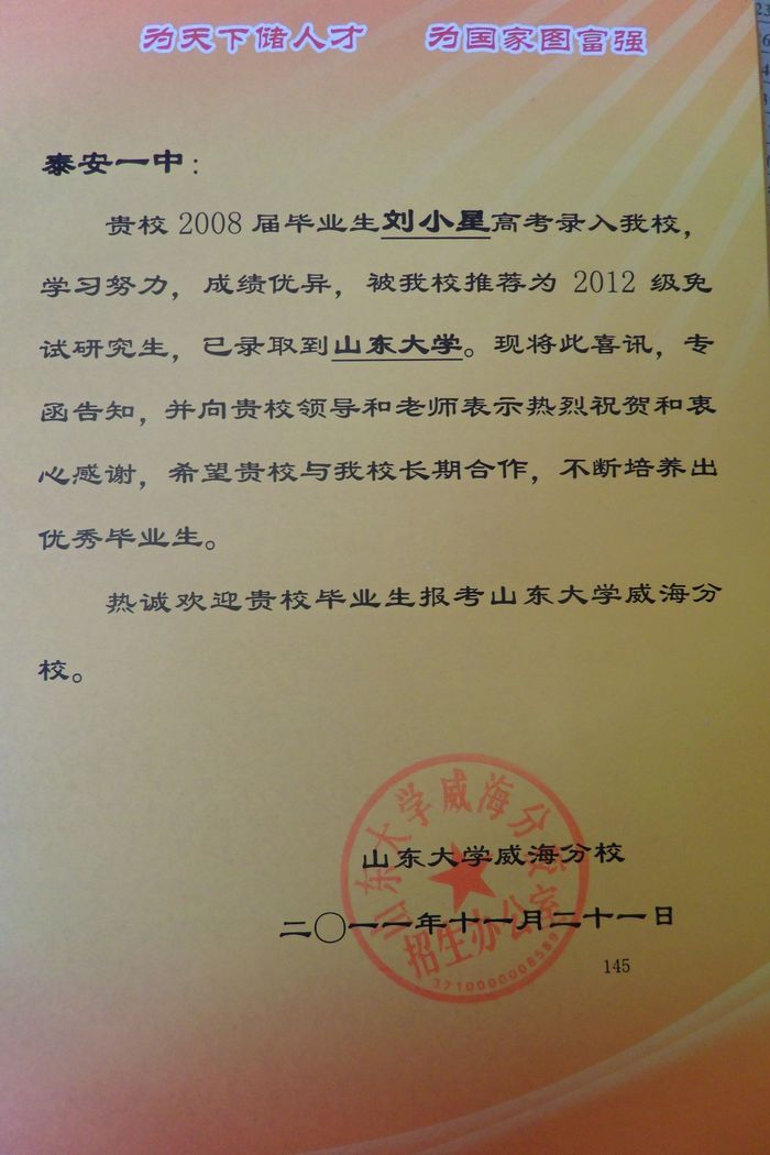 山东大学致我校喜报