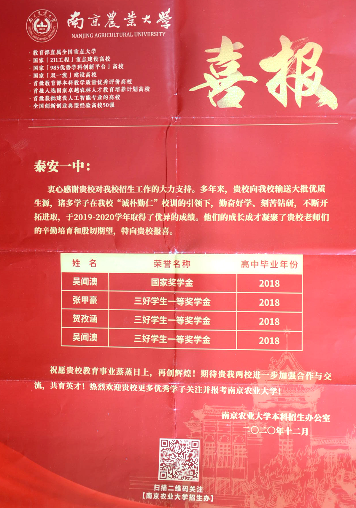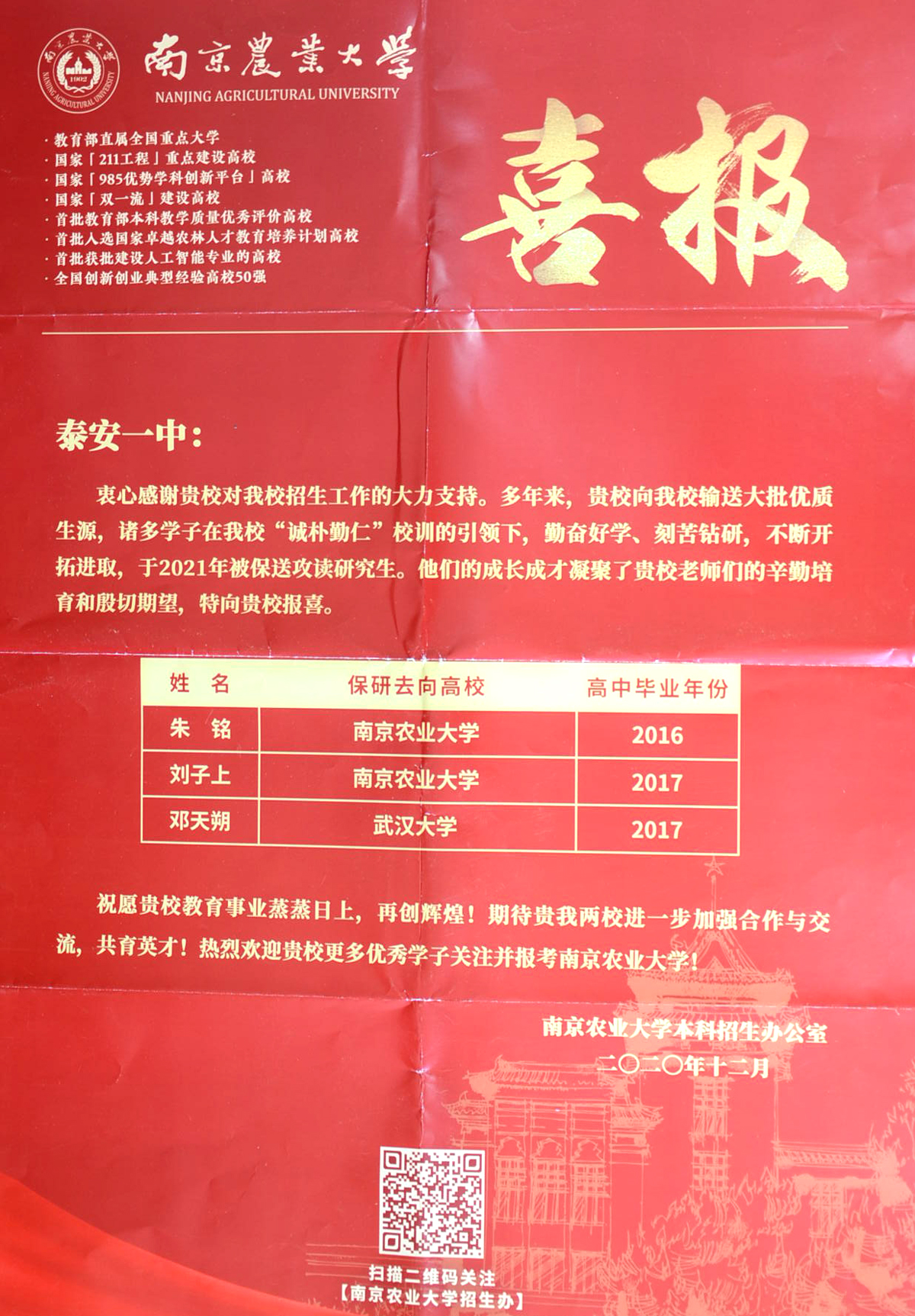 兰蕙芬芳,桃李争妍,不负韶华再追梦。2020年,泰安一中先后收到了清华大学、北京大学、复旦大学、中国科学院大学等50多所重点大学发来的喜报。泰安一中是北大、清华、复旦等全国近六十所重点大学命名的优质生源基地,领跑在为重点大学输送优秀生源学校的前列,每年学校都会收到大批高校发来的喜报、贺信。泰安一中历年培养的优秀毕业生不仅高考成绩优异、考上的名牌大学数量多,而且到了大学以后,综合素质全面、发展后劲足、可持续发展能力强。他们中有的获得国家奖学金,有的获得三好学生、本科特优生、优秀学生干部等荣誉称号,在不同的岗位上也屡创佳绩,为泰安一中争得了荣誉。 泰安一中坚持以学生为中心的办学思想,积极开发先进的课程体系。“一个中心、五个平台”的发展性课程体系为学生发展提供良好的平台。学校根据学生的兴趣爱好开设学科竞赛辅导,为学生的特长发展提供支持。学生在数学、物理、化学、生物、信息五大学科竞赛、作文大赛、英语竞赛中充分展现出个人的才质和特长,取得了优异成绩;学校不仅重视学习成绩,更着眼于学生的全面发展,重视学生综合素质的培养。学校每年的社团活动与课本剧展演、师生书画展、歌咏比赛、运动会等文体活动,发掘了学生的创新潜力,培养了学生的创新能力,提高了学生的综合素养,让学生的身心得到全面发展。 未来泰安一中将继续围绕出名师、育名生、创名校的办学目标,进一步完善、优化创新人才、拔尖人才的培养体系,打造适合学生全面发展、个性化发展的平台,让更多一中学生走入名牌大学,走向更广阔的发展舞台,为国家和民族振兴贡献力量。