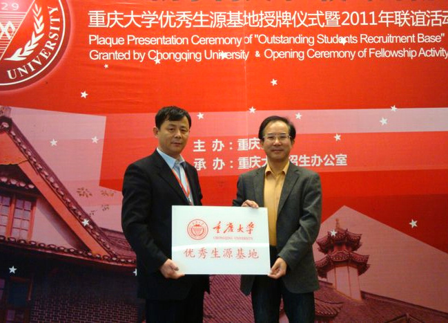 11月11日,重庆大学优秀生源基地授牌仪式暨2011年联谊活动开幕式在重庆大学隆重举行。来自全国23个省市100余所重点中学的校长及嘉宾应邀出席,我校因近年来向重庆大学输送生源多、综合素质高、持续发展能力强,被授予“优秀生源基地”,夏法卫副校长参与授牌仪式。 据了解,重庆大学位于重庆市沙坪坝,创办于1929年,学校占地面积5700亩,有A、B、C、虎溪四个校区。学校是教育部直属重点大学、31所中央副部级直管高校、34所研究生自主划线高校、国家“211工程”和“985工程”重点建设高校。 |