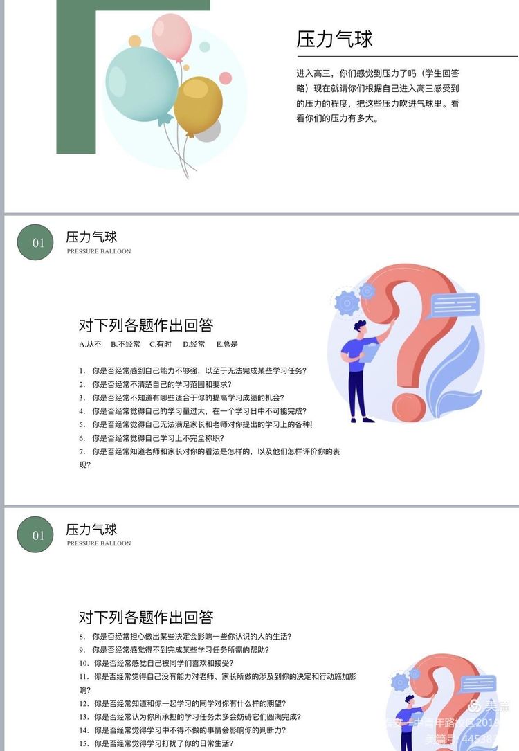 通过“压力气球”和“压力图画”的方式,同学们了解自己的压力来源,对自己所受压力的程度有一个定位,从而正视压力。并通过分享“人生故事”,同学们知道:有压力正常,但不能让过分的压力将自己的目标挤出人生之外!