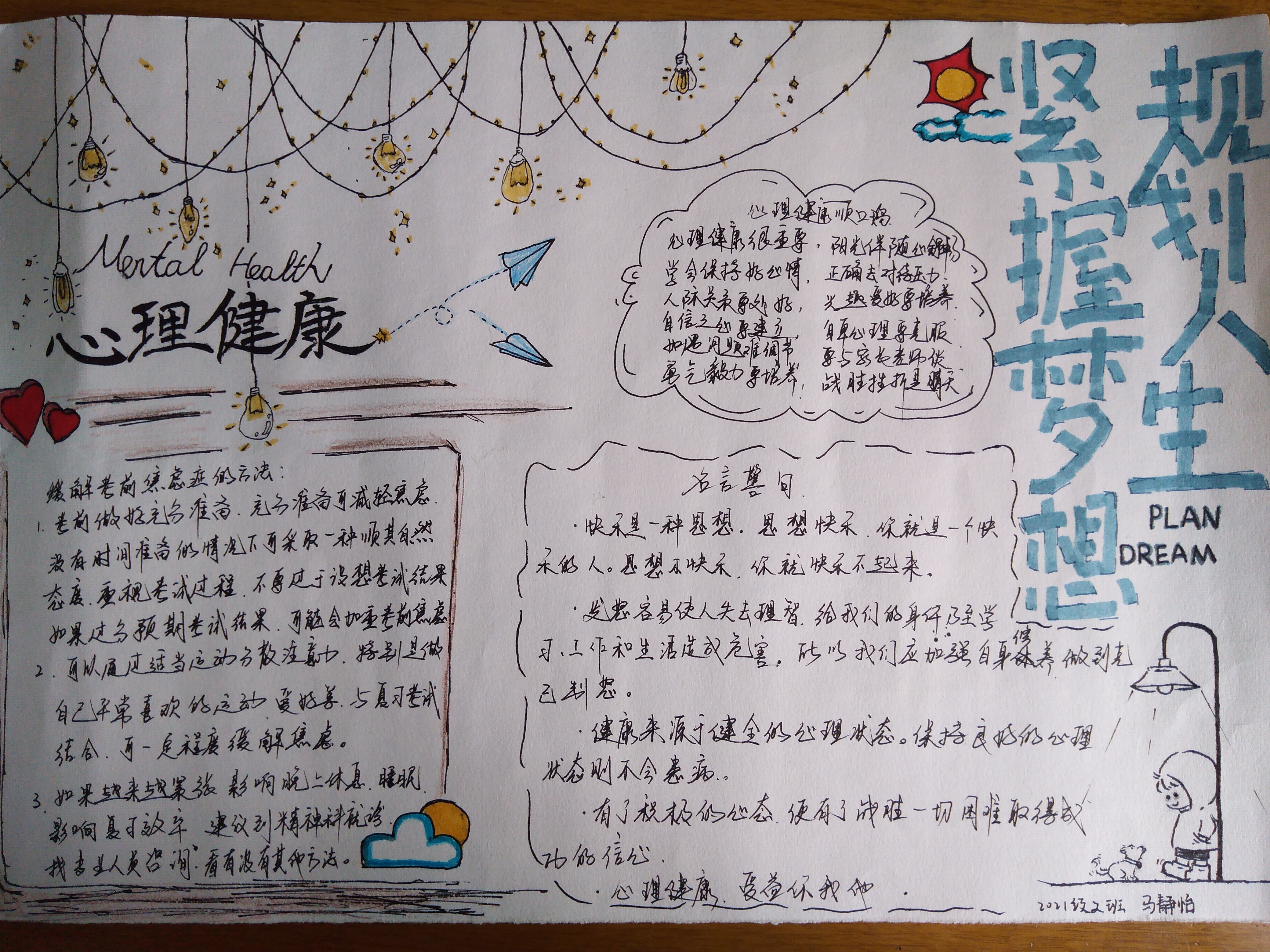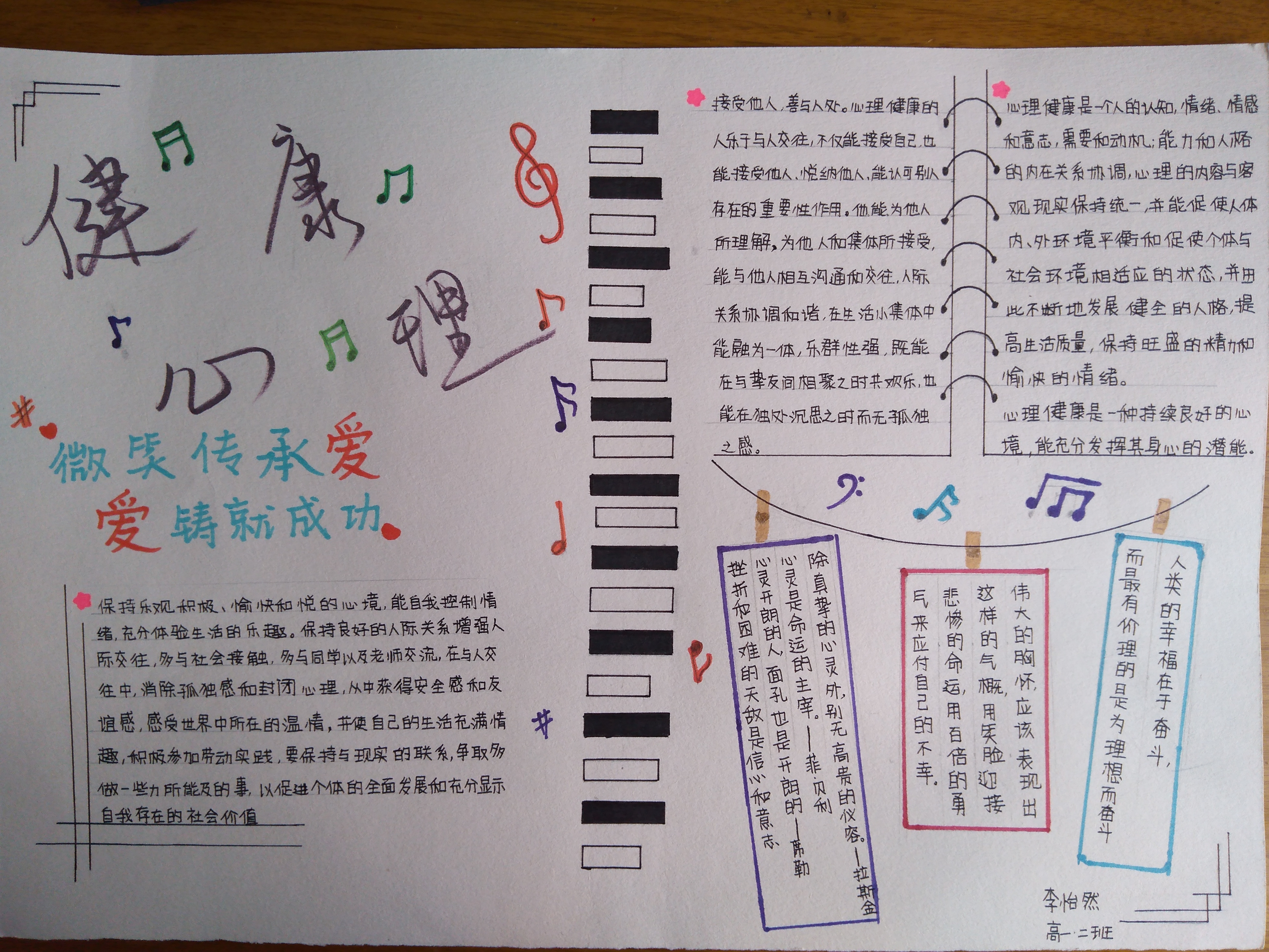 为了更好地普及心理健康教育常识,提高学生的心理自我调节能力,丰富学生的文化生活.近期,泰安一中开展了心理健康手抄报比赛活动。 本次手抄报活动的主题以心理健康教育常识为主,各班心理委员精心组织,同学们积极参与, 借助手中的画笔绘制成了一幅幅版面精美、内容丰富、布局新颖、短小精悍、书写清晰的手抄报作品。心理咨询室的老师和美术办公室老师组成了评审小组,经过认真的评比,本次心理健康手抄报比赛,评出一等奖15人,二等奖14人,优秀奖13人。 2021年心理健康手抄报比赛获奖名单: 一等奖15人 李怡然 王欣然 欧阳佳凝 张泽瑞 梁佳琪 马静怡 宋辰宇 王晓宇 孙淑贤 刘雅茹 王姿媛 张旖旎 王业凡 王雨菲 高 丰 二等奖14人 潘光耀 郭轩辰 李新实 和怡君 张建伟 侯韵函 杨一帆 张仁泽 赵 晨 王俊瑞 王文硕 褚心月 孙玉涵 吴再格格 优秀奖13人 张骞宇 刘旺运 张宪政 韩梦飞 张子恒 张凡锐 吕奕麟 马明阳 赵嘉丽 吕博文 次珠旺久 尼玛曲珍 桑吉卓玛 【部分获奖作品展】